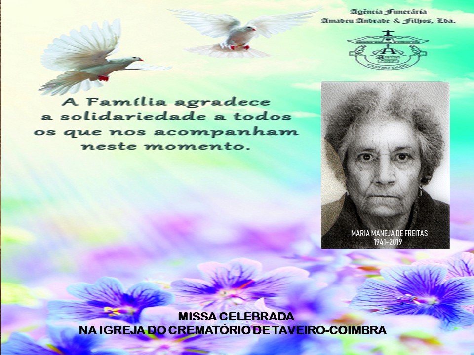 FALECIMENTO DA SENHORA Dª MARIA MANEJA DE FREITAS -77 ANOS (TAVEIRO-COIMBRA) IRÁ AMANHÃ DOMINGO PARA A IGREJA DO CREMATÓRIO DE TAVEIRO-COIMBRA, FUNERAL REALIZA-SE ÁS 16H 30M , SERÁ CREMADA NO CREMATÓRIO DE TAVEIRO-COIMBRA.