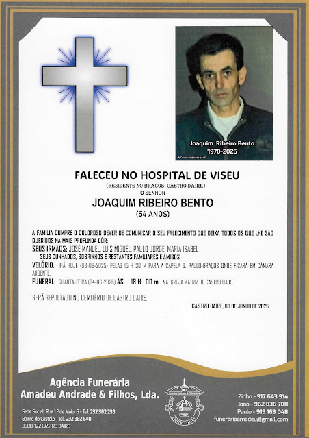FALECIMENTO JOAQUIM RIBEIRO BENTO-54 ANOS (BRAÇOS-CASTRO DAIRE) A FAMILIA CUMPRE O DOLOROSO DEVER DE COMUNICAR O SEU FALECIMENTO QUE DEIXA TODOS OS QUE LHE SÃO QUERIDOS NA MAIS PROFUNDA DÔR: SEUS IRMÃOS: JOSÉ MANUEL, LUIS MIGUEL, PAULO JORGE, MARIA ISABEL SEUS CUNHADOS, SOBRINHOS E RESTANTES FAMILIARES E AMIGOS VELÓRIO: IRÁ HOJE (03-06-2025) PELAS 15 H 30 M PARA A CAPELA S. PAULO-BRAÇOS ONDE FICARÁ EM CÂMARA ARDENTE, FUNERAL: QUARTA-FEIRA (04-06-2025) ÁS 18 H 00 m NA IGREJA MATRIZ DE CASTRO DAIRE. SERÁ SEPULTADO NO CEMITÉRIO DE CASTRO DAIRE.