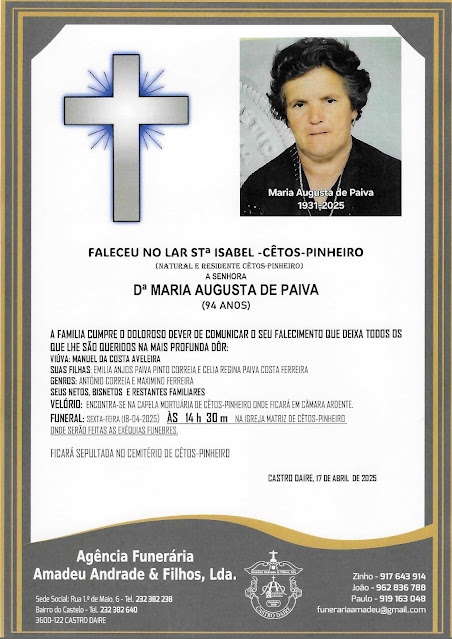 FALECIMENTO DA SRªDªMARIA AUGUSTA DE PAIVA-94 ANOS (CÊTOS-PINHEIRO) VIÚVA: MANUEL DA COSTA AVELEIRA SUAS FILHAS: EMILIA ANJOS PAIVA PINTO CORREIA E CELIA REGINA PAIVA COSTA FERREIRA GENROS: ANTÓNIO CORREIA E MAXIMINO FERREIRA SEUS NETOS, BISNETOS E RESTANTES FAMILIARES VELÓRIO: ENCONTRA-SE NA CAPELA MORTUÁRIA DE CÊTOS-PINHEIRO ONDE FICARÁ EM CÂMARA ARDENTE. FUNERAL: SEXTA-FEIRA (18-04-2025) ÀS 14 h 30 m NA IGREJA MATRIZ DE CÊTOS-PINHEIRO ONDE SERÃO FEITAS AS EXÉQUIAS FUNEBRES. FICARÁ SEPULTADA NO CEMITÉRIO DE CÊTOS-PINHEIRO